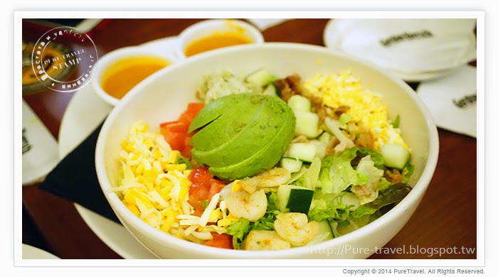 混合生菜加上蟹肉、蝦仁、水煮蛋、培根、黃瓜、蕃茄、查特傑克起司及新鮮鱷梨