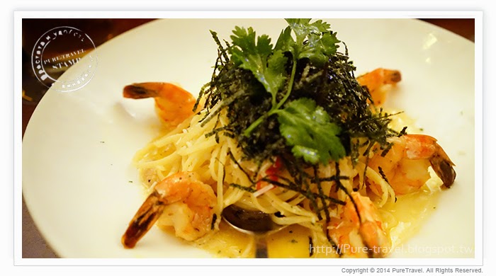 義大利細麵搭配鳳尾蝦、洋蔥、辣椒及檸檬汁